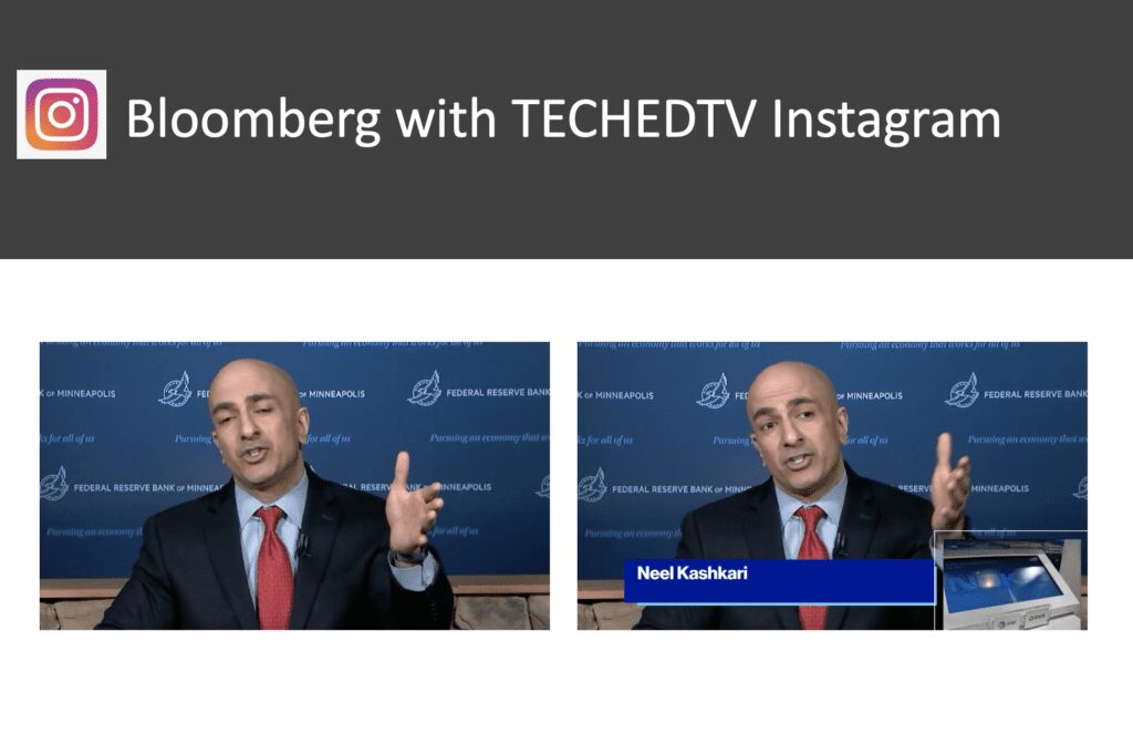 Instagram can also be made part of the Bloomberg or CGTV feed as shown in the bottom right corner of the screen. As the video starts playing, web elements slide up and down from the screen which are animated with web-based standard technologies.