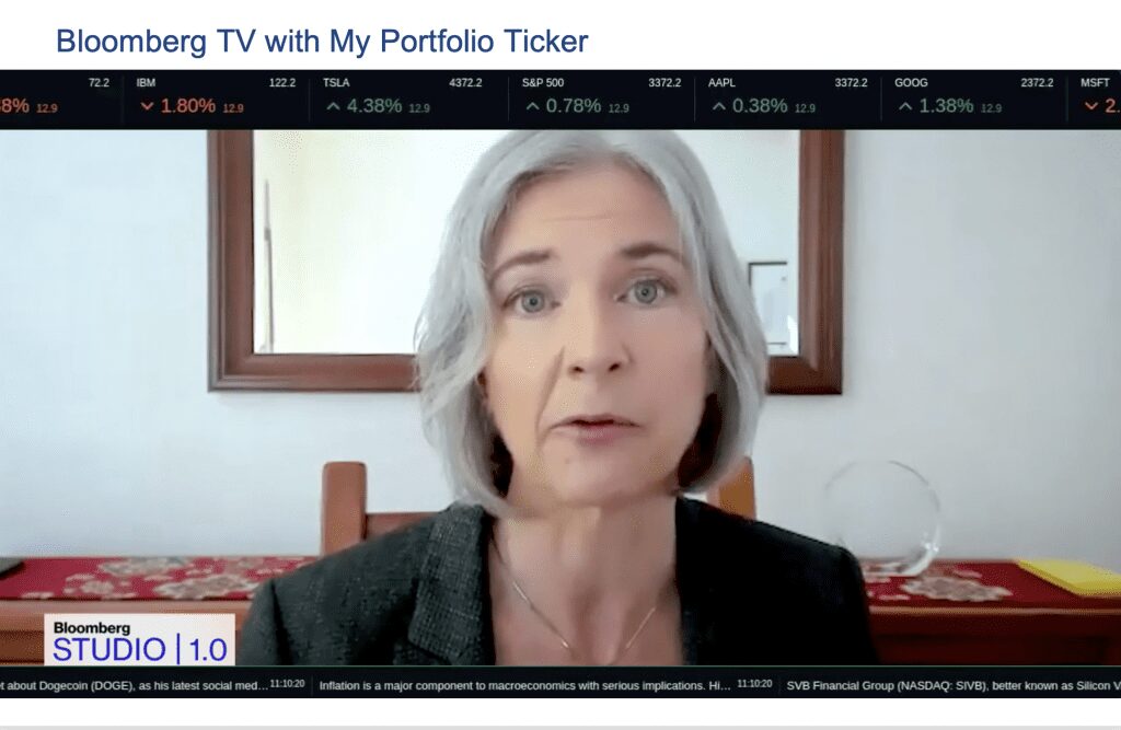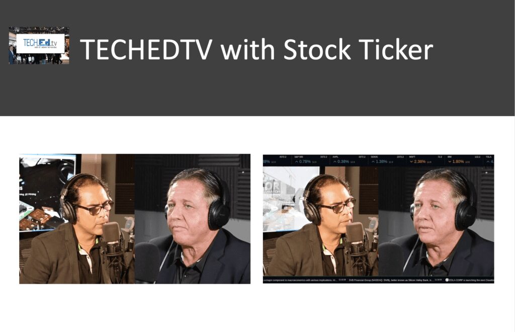 In the following picture, a screen shot from Bloomberg TV was recorded as of May 16th, 2021 and the contents from the top and bottom are replaced with the ticker widget containing a customized version of the stock portfolio. The stock portfolio ticker (black) on the top and bottom is generated instantly in the cloud and made part of a real-time video feed.